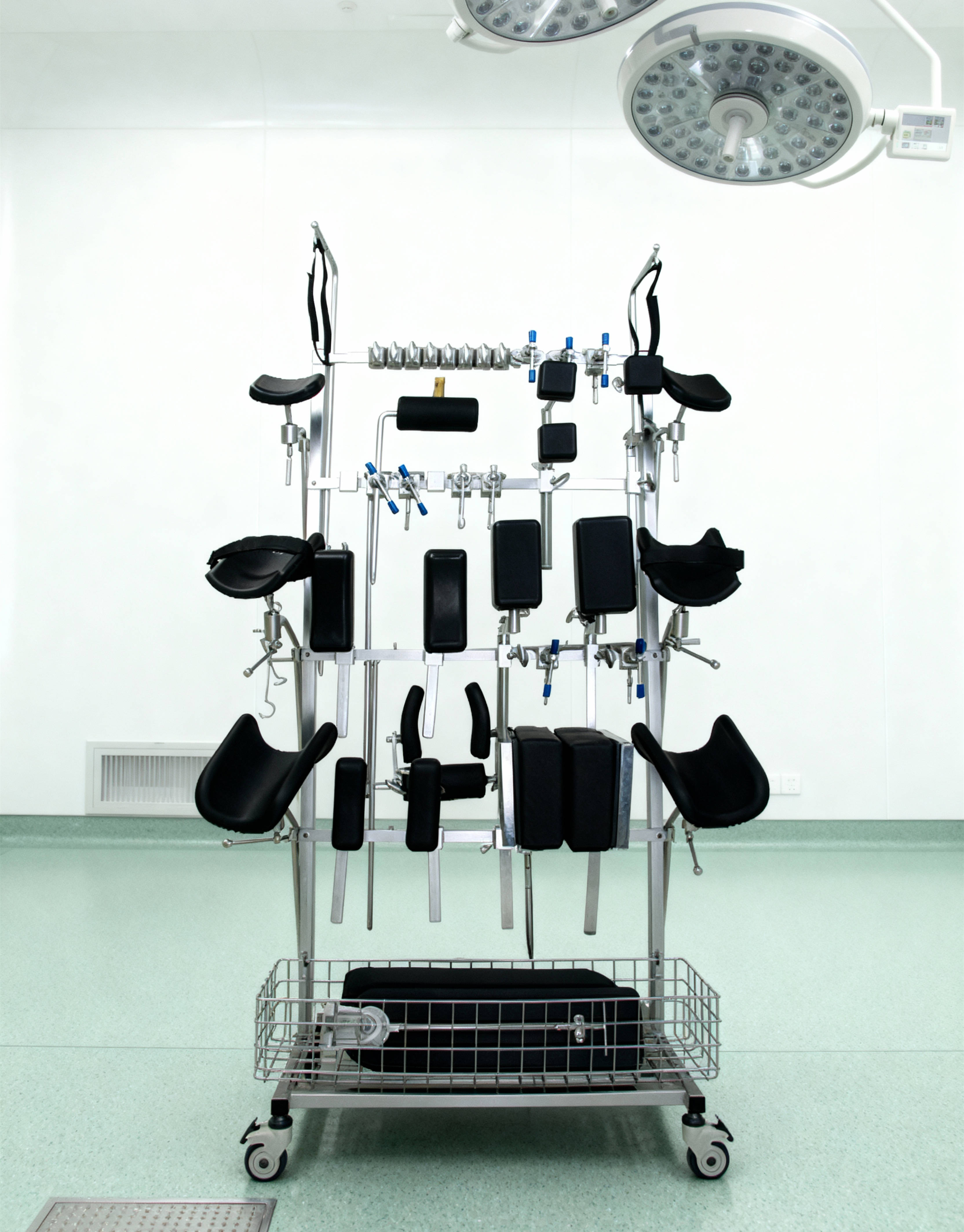 針對(duì)手術(shù)室多樣化配件需求,打造科學(xué)收納體系:麻醉屏架、卡肩架、卡腰架、側(cè)臥位支身架、托腿架、膝關(guān)節(jié)支架等數(shù)十種常用大件配件,均有專屬固定位置,分類擺放一目了然,告別混放混亂;底部增設(shè)高承載網(wǎng)籃,綁帶、邊軌鎖緊器等小件物品可集中分類存放,杜絕散落遺失,真正實(shí)現(xiàn) “隨用隨取、精準(zhǔn)拿取”。