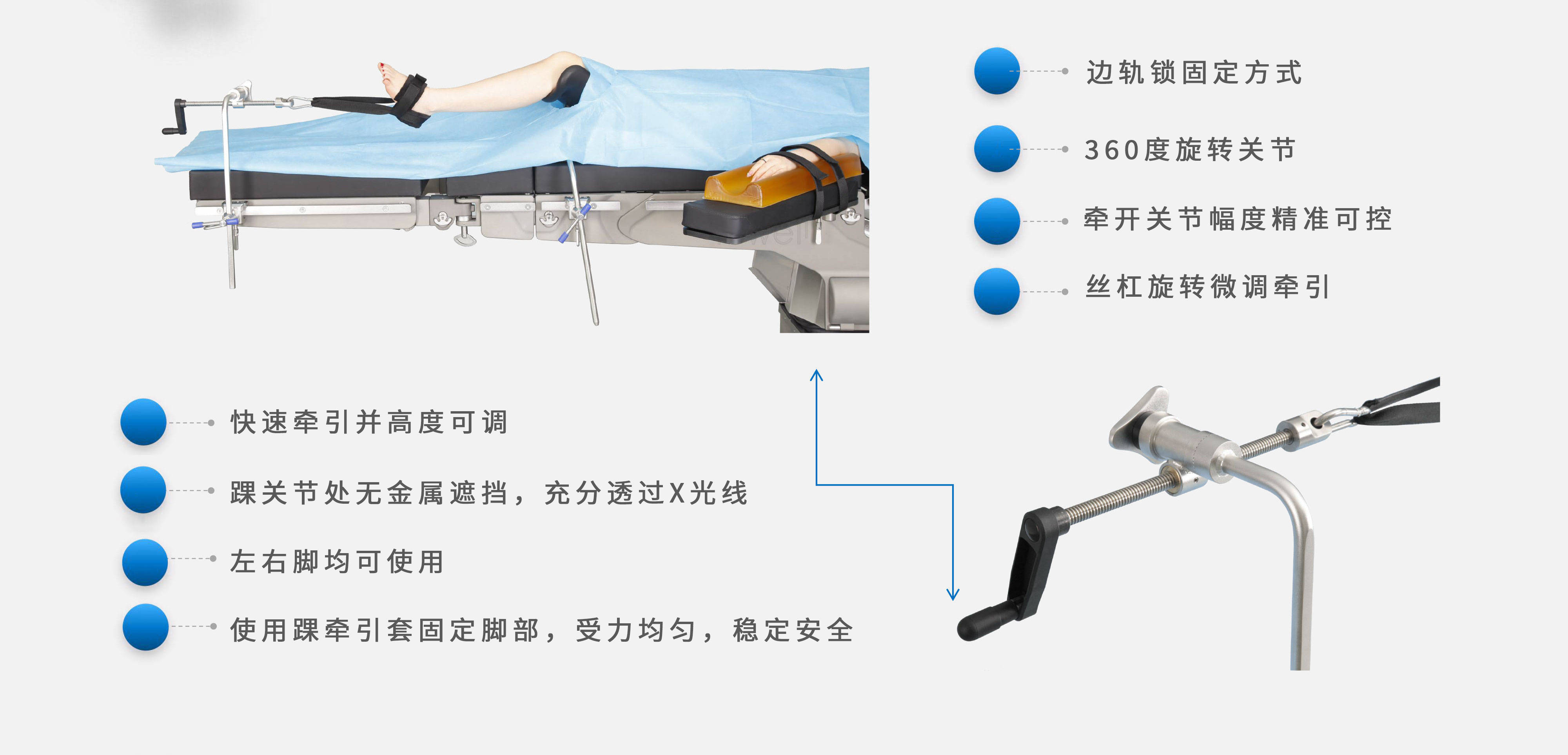 無(wú)遮擋透視,該牽引架在踝關(guān)節(jié)關(guān)鍵區(qū)域采用無(wú)金屬遮擋設(shè)計(jì),確保了術(shù)中X光透視的完整性和清晰度。這一特性允許手術(shù)團(tuán)隊(duì)在需要時(shí)能夠即時(shí)、無(wú)干擾的獲取關(guān)節(jié)內(nèi)部的影像信息,為術(shù)中實(shí)時(shí)評(píng)估和決策提供可靠依據(jù),極大地增強(qiáng)了復(fù)雜手術(shù)的精準(zhǔn)性與安全性。