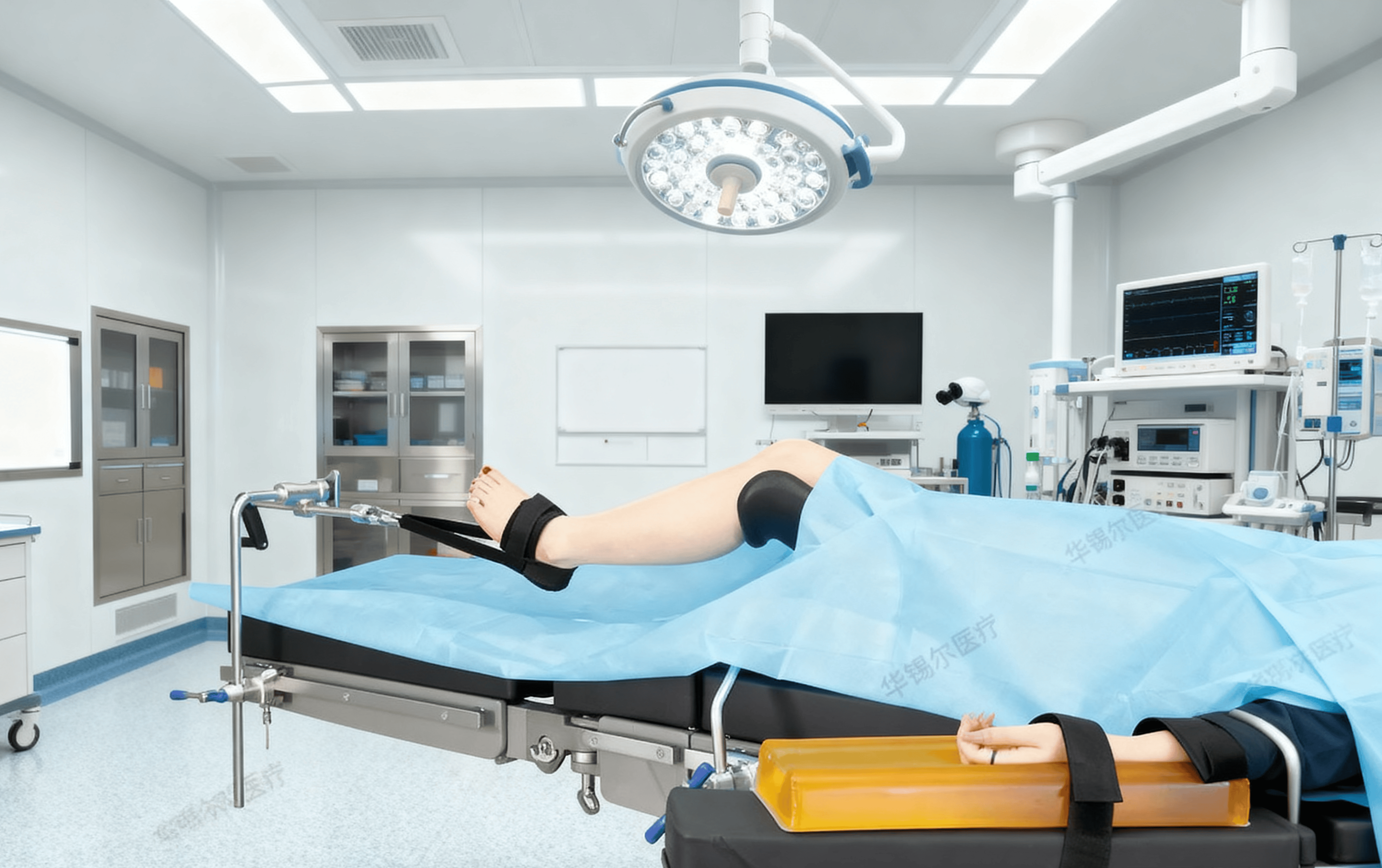 穩(wěn)定牽引,視野清晰,該牽引架通過其牽拉部件對(duì)手術(shù)區(qū)域軟組織進(jìn)行可控、均勻的牽拉,能有效擴(kuò)大關(guān)節(jié)間隙,為鏡下操作提供開闊且清晰的視野。醫(yī)生得以在直視下精確辨識(shí)和處理病變組織,減少不必要的組織損傷,提升手術(shù)效率與效果。配合踝部固定套,可實(shí)現(xiàn)患者腳部的安全穩(wěn)定固定,有效防止術(shù)中因體位滑動(dòng)導(dǎo)致的視野偏差,保障手術(shù)全程的穩(wěn)定性。